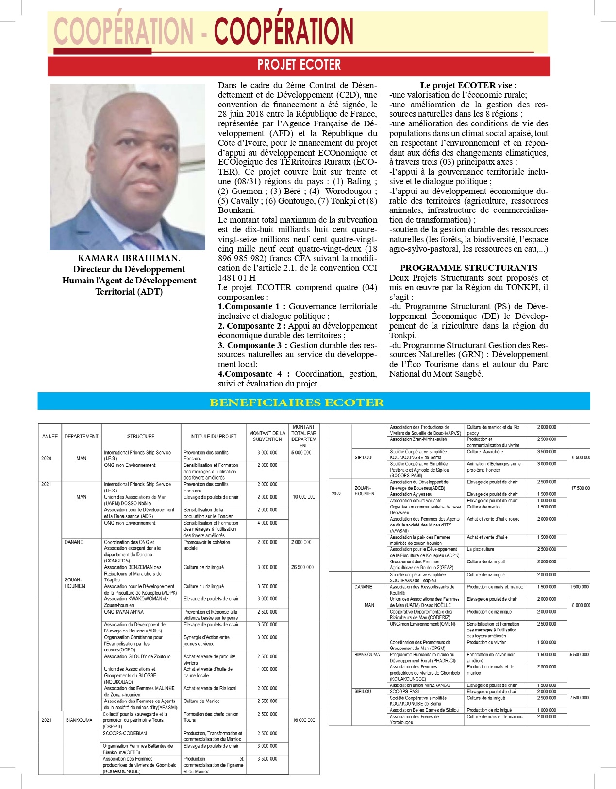 Dans un contexte de forte croissance démographique et d’une arrivée de nombreux jeunes chaque année sur le marché du travail, les enjeux auxquels fait face le monde rural ivoirien se cristallisent autour de la croissance économique soutenable, la création d’emplois et la cohésion sociale. L’appui au développement durable des territoires ruraux est une réponse à ces enjeux. Plus préciséement, le projet ECOTER a pour objectif « d’améliorer les conditions de vie des populations dans un climat social apaisé aux bénéfices de 8 Régions de Côte d’Ivoire : Bafing, Béré, Bounkani, Cavally, Gontougo, Guémon, Tonkpi et Worodougou. Le Groupement BRLi-BRLiCI-GOPA réalise l’assistance à maitrise d’ouvrage du Comité de Suivi et de Pilotage (CSP) porté par le Ministère ivoirien de l’Intérieur et de la Sécurité (MIS).